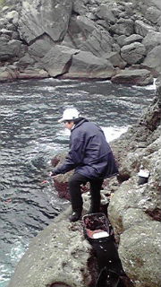 クラブの副会長の笹田名人がカッパを忘れていて、船頭さんから貸してもらった服があまりにも似合っているからと、一緒に磯上がりしてた田中名人が写真を撮って送ってくれましたのでアップしときます♪