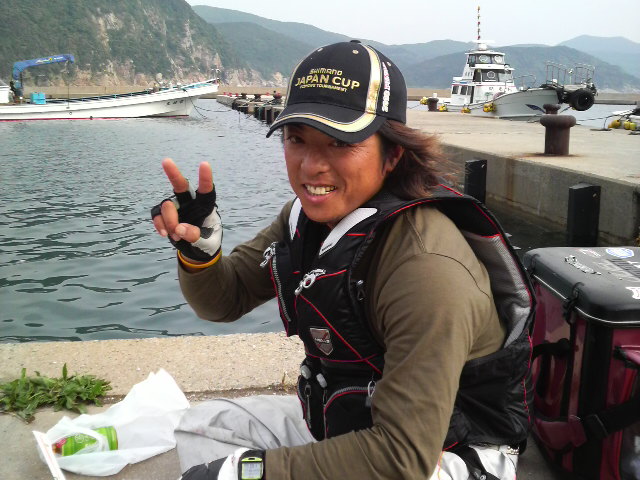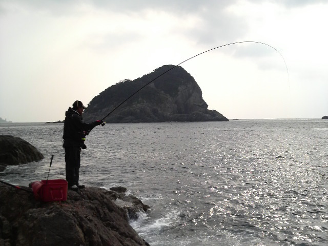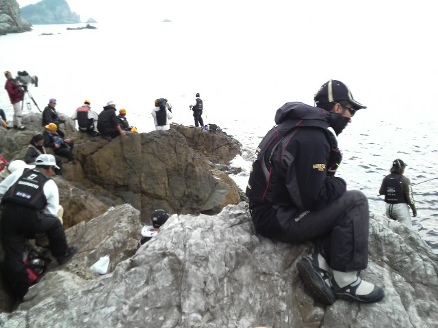 やってしまった… 直接対決決定! こうなれば一生懸命やるしかない。出船後、港に近い磯に上がることとなった。私達2人だけではない、各報道人、シマノスタッフも合わせて約10名ほど。緊張しないといえば当然嘘になる。仕掛けを準備して開始時間を待つ… プライベートならぐちゃぐちゃとやかましいほど会話をしながらの2人に一斎会話はない… ホイッスル! 試合は始まった。 だが開始20分ほど経過しても両者アタリ無し。 やがて海に変化が…満ち潮の到来である。師匠、ヒット!良型のグレが網に納まるも、私は見て見ないフリ… 続いても師匠ヒット!またまた良型!ヤバイなぁ 立て続けに師匠にヒット!だめ押しかと思うほどの連続ヒットにハイテンション(汗)私は未だにアタリ無し。ようやく私にもアタリがあり先ずは1匹目。場所交代と同時のヒットで2匹目をゲットしたところで場所交代!5分のインターバル後、後半戦開始!一投目から私にヒット!
